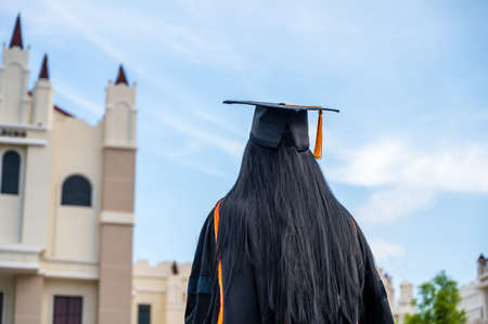 Graduation ceremony, back view of young asian woman in graduation gown and cap throwing up confetti.