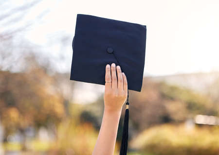 Cheers to college, come on down future. Shot of an unrecognisable woman holding her graduation cap at university.