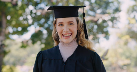 Education, woman and portrait outdoor at graduation for qualification, university success and ceremony. Graduate, student and happy with milestone, scholarship award or academic achievement on campus