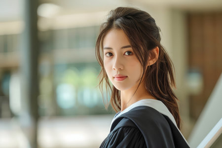 Portrait of a Young Woman with a Genuine Smile in a Graduation Gown Looking Over Her Shoulder Indoors AI Generative