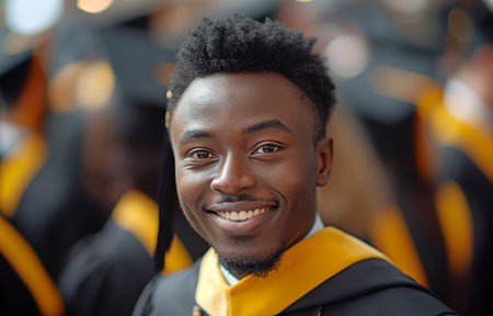 Happy African graduate celebrating at commencement ceremony, wearing traditional graduation gown and cap, with arms raised in joy amidst fellow graduates.