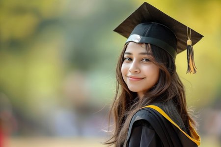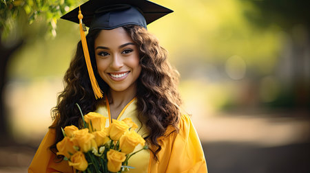 Happy diverse multiracial female graduate student in cap and gown with sunny bokeh background