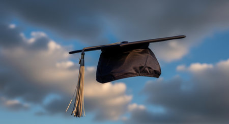 A black graduation cap with a tassel is thrown into the air against a dynamic sky with white and grey clouds. Represents academic achievement, success, and the end of studies.