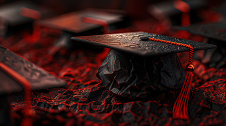 Graduation caps arranged on textured surface, featuring striking red and black color scheme. scene evokes sense of achievement and celebration, perfect for commemorating academic success