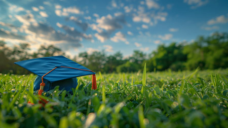 Blue Graduation Cap Lying in Green Grass on Sunny Day