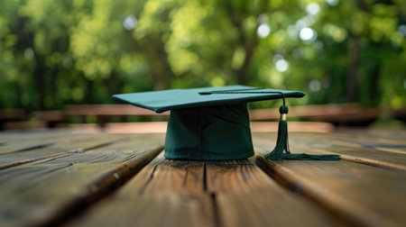 A graduation cap sits on a wooden surface, surrounded by a blurred backdrop of trees displaying autumn colors. This moment captures the essence of academic achievement and celebration.