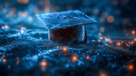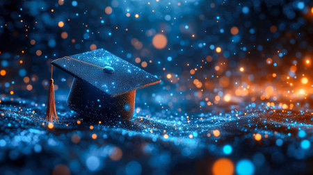 Abstract glowing graduation cap on digital sparkles, symbolizing academic success, technology, and future learning.