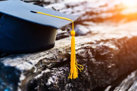 Close-up Black Graduation Hat and Yellow Tassel placed on the floor