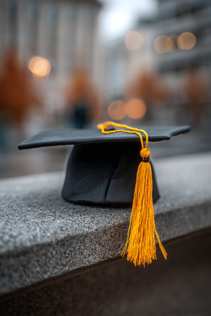 A black graduation cap with a yellow tassel rests on a stone ledge. The urban environment displays blurred buildings and warm evening lights creating a celebratory atmosphere.