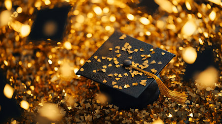 A black graduation cap lies on a bed of gold confetti, symbolizing the achievement of a milestone.