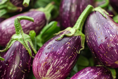 Closeup of vibrant, purple striped eggplants with green stems, freshly harvested
