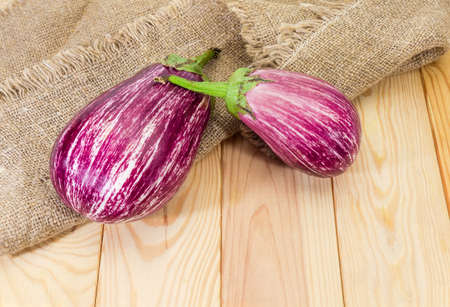 Ripe raw purple with white striped eggplants also known as Graffiti eggplant on a burlap and light colored wooden surface