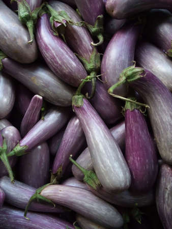 Closeup view of small purple Asian eggplants, food background photography. Pile of fresh eggplants at Indian market, vegetarian food. Above small Asian purple eggplants, ecology and nature concept