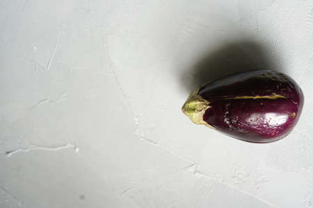 Trendy ugly organic eggplant on grey table, with copy space