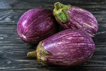 Purple eggplants fresh for cooking on wood background