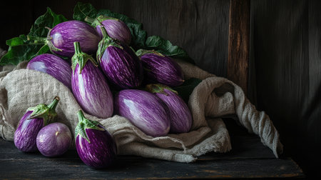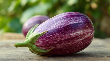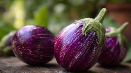 Fresh striped eggplants on a rustic wooden surface in a natural setting
