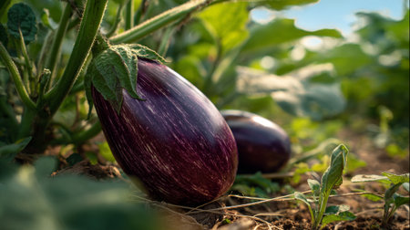 Fresh organic eggplant growing in a vegetable garden under warm sunlight.