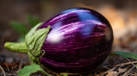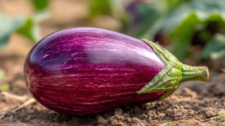 Striking Violet Eggplant on Brown Ground, Fresh from the Garden
