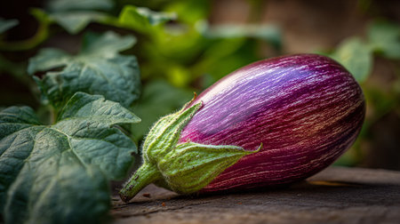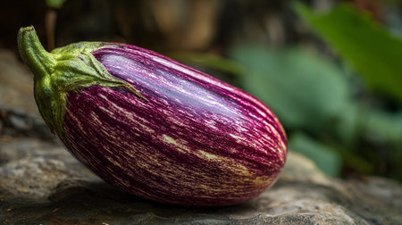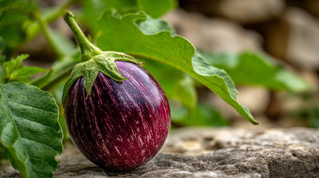 Elegant striped eggplant with fresh green leaves nestled on rustic stone