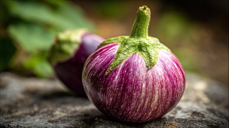 Fresh Duo of Graffiti Eggplants Resting on Stone Surface in Garden