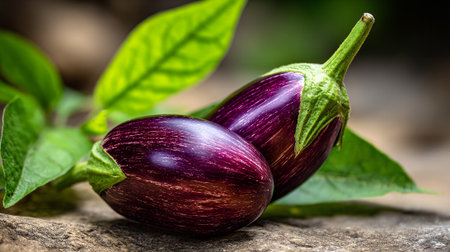 Vibrant Purple Eggplants Displayed on a Rustic Stone Surface with Green Leaves