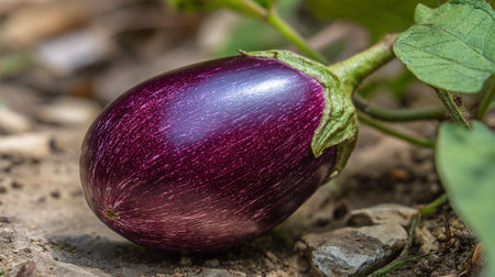 Ripe aubergine growing, exhibiting its vibrant purple colour on the garden ground.