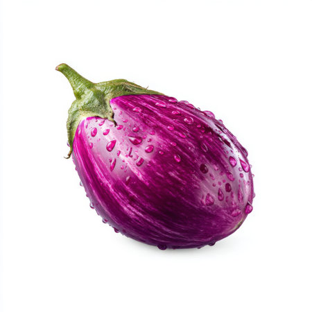 This image showcases a fresh purple eggplant with glistening water droplets on a clean white background, perfect for culinary and gardening themes.