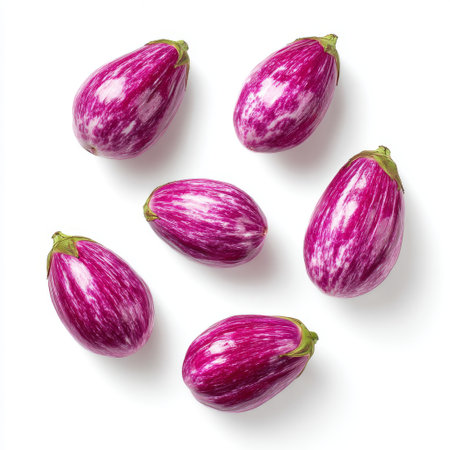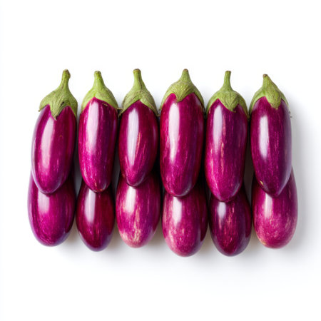 A collection of six fresh purple eggplants resting on a clean white background, showcasing their vibrant color and unique striped pattern. Ideal for culinary use and healthy eating representations.