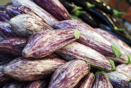 Eggplants with stripes purple and white at the market
