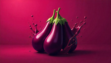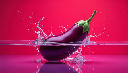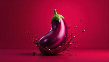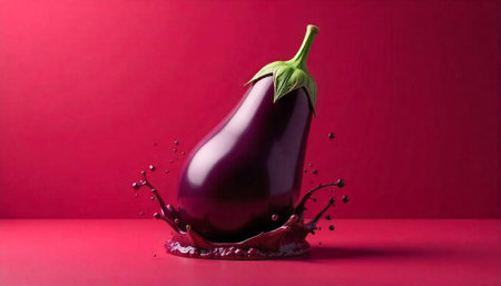Shiny eggplant splashing in vibrant liquid against red backdrop