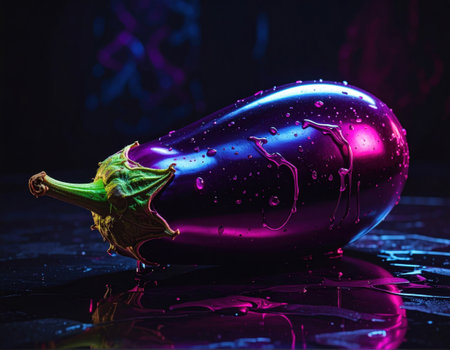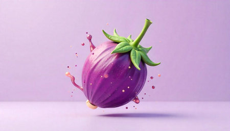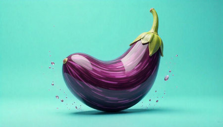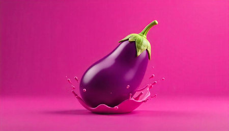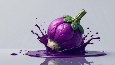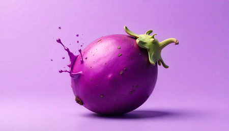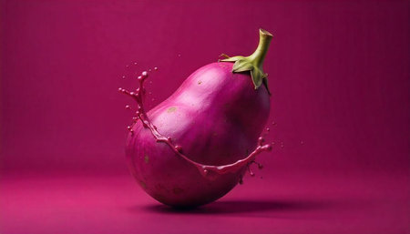 Vibrant eggplant with liquid splash on matching background
