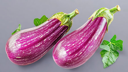 This image features two fresh organic eggplants with a vibrant purple hue and green leaves, perfect for showcasing healthy cooking and culinary creativity.