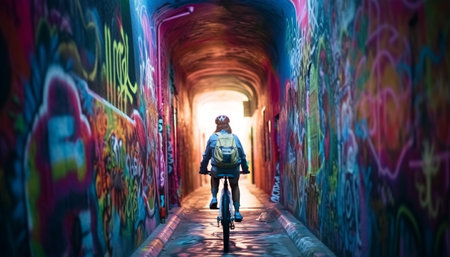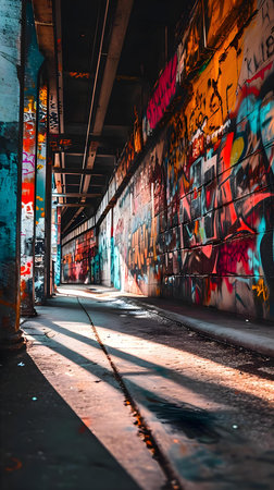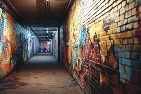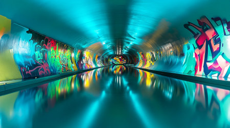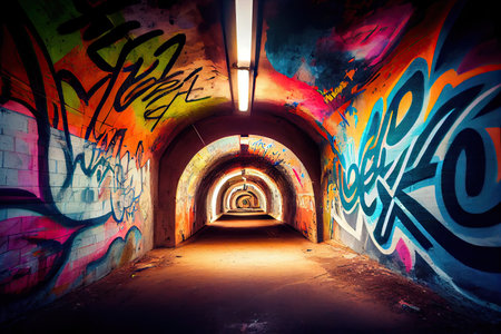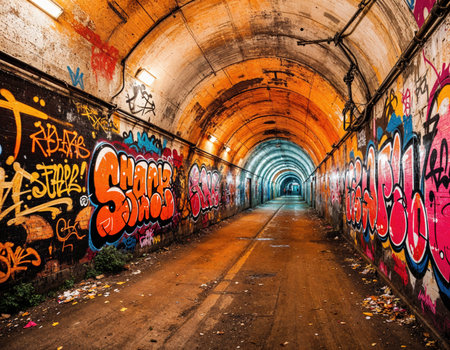 urban art scene, artistic street tunnel now a vibrant graffiti haven with elaborate designs and vivid hues extending endlessly