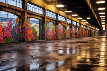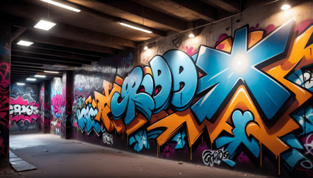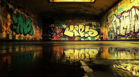 underground tunnel with bright graffiti, tags and murals, created with generative ai