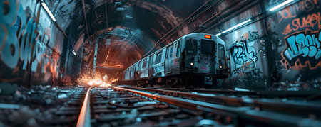 This image depicts a dystopian subway train rushing through a decrepit graffiti covered tunnel with sparks flying as it navigates broken tracks The scene conveys a sense of urban decay danger and the