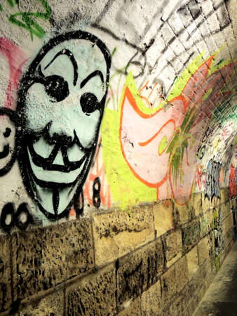 Grafitti drawn on walls of walkway in a tunnel subway sidewalk art