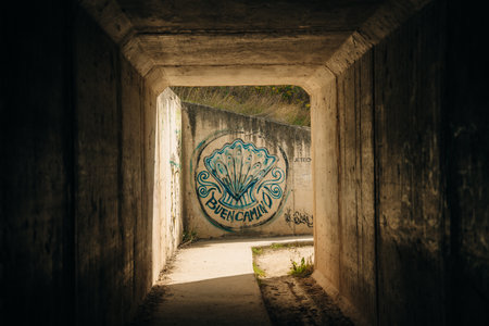 Shadowy tunnel with graffiti-covered walls, mysterious road, urban exploration