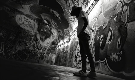 Black and white portrait of a man in a dark tunnel with graffiti