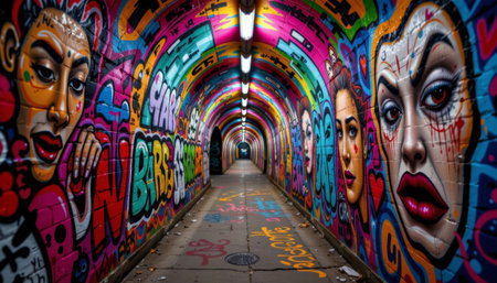 A graffiti tunnel with colorful street art portraits and vibrant abstract designs covering walls and ceiling, creating energetic urban atmosphere