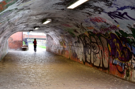 woman with hat walking in a pedestrian tunnel with grafitti