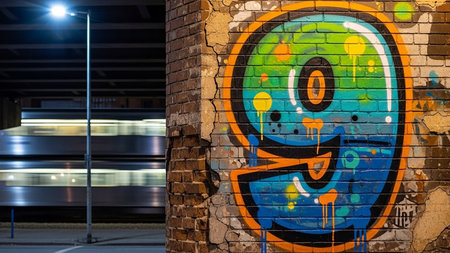 Colorful graffiti on a brick wall beside a city street at night with blurred lights