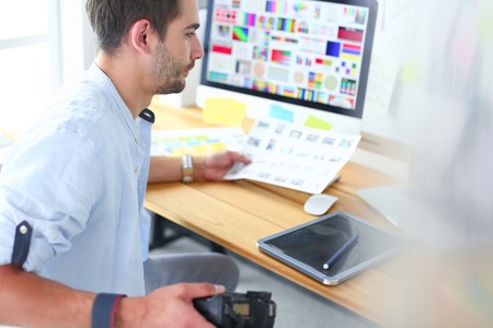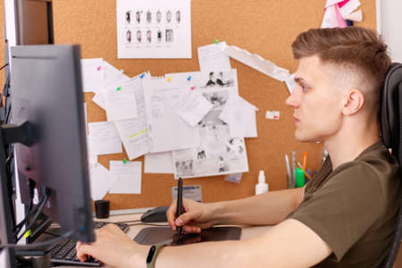 Young man working in a graphic designer studio. Selective focus.