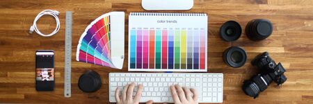Male designer work at wooden table top view closeup background. Online help service concept