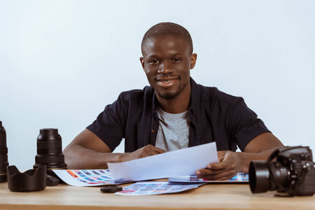 portrait of smiling african american photographer sitting at workplace with photoshoot examples and photo camera and looking at camera