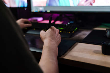 Professional colorist working on a graphic tablet. Design innovations creative projects. Digital media concept