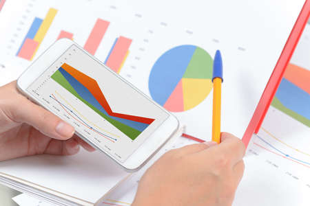 Hands holding mobile phone with analyzing graph and documents in background