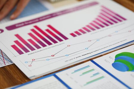 Close-up of biz documents with statistics data in charts, graphs and diagrams. Financial forecast of growth income. Stock Exchange, Securities Market concept. Blurred background