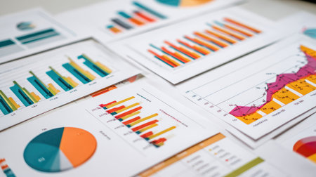 A collection of colorful graphs and charts displayed on papers, representing key business data for effective analysis and presentation in a professional setting.