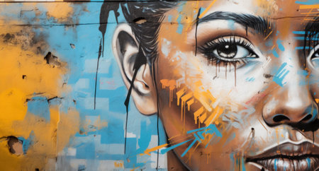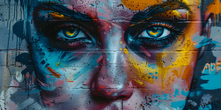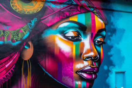 Vibrant street art portrait of a woman with bold colors and intricate details