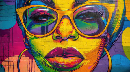 Vibrant street art featuring a bold, colorful portrait of a woman with sunglasses, set against a bright mural backdrop.